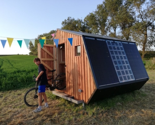 une cabane de jardin durable de 3,2 x 2,6 m au sol, couverte de 10 m² de panneaux solaires, facile à assembler en autoconstruction, sans dalle de béton.